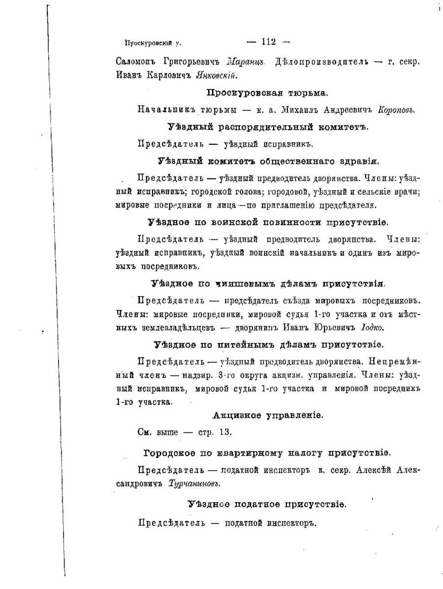 Text on the Chechelnik Books DatabaseCyrillic text: Пуоскуровский у. — 112 — Саломон Григорьевич Ыаранц. Делопроизводптель — г. секр. Иван Карлович Янковский, Проокуровская тюрьма. Начальник тюрьмы — к. а. Михаил Андреевич Коропов. Уездный распорядитфльный комитфт. Председатель — уездный исправник. Уездный комитет общфствфннаго здравия. Председатель — уездный предводитель дворянства. Члены: уездный исправник; городской голова; городовои, уездный и сельские врачп; мировые посрг>дники и лица — по приглашению председателя. Уездное по воинской повинности присутствиф. Председатель — уездныя предводитедь дворянства. Члены: уездный исправник, уездный воинский начальник и один из мировых посредников. Уездноф по чиншфвым делам присутствия. Председатель — итредседатель съезда мировых посредников. Члены: мировые посредники, мировой судья 1-го участка и от местных землевладельцев — дворянип Иван Юрьевич Иодко. Уездноф по питфйным делам приоутствиф. Председатель — уездный предводигель дворянства. Непременный член —надзир. 3-го округа акцизн. управления. Члены: уездный исправник, мировой судья 1-го учаетка и мировой посредник 1-го уиастка. Акцизноф управлфниф. См. выше — стр. 13. Городскоф по квартирному налогу присутствиф. Председатель — податной инспектор к. секр. Алексей Александрович Турчанинов. Уездное податноф присутствиф. Председатель — податной инспектор. | Translated text: Puoskurovsky y. - 112 -