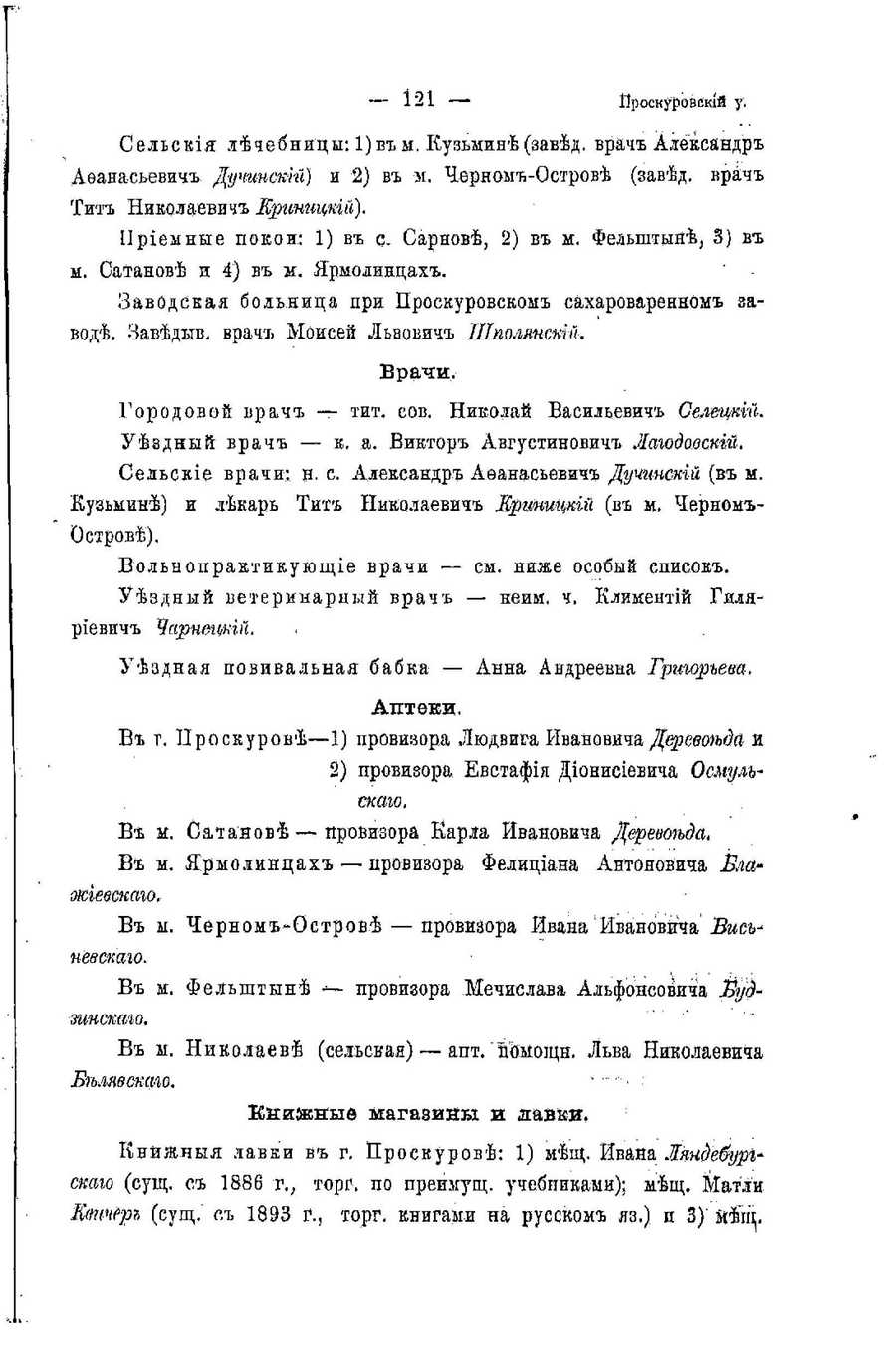 Text on the Chechelnik Books DatabaseCyrillic text: — 121 —" Нроскуровский у. Сельекия лечебницы: 1)въм. Кузьмияе (завед. врач Александр Афанасьевич Дучинский) и 2) в м. Черном-ОСтрове (завед. врач Тит Николаевич КриницкШ). Иириемные покои.: 1) в с. Сарнове, 2) в ы. Фелынтыне, 3) в м. Сатанове и 4) в м. Ярмолинцах. ЗавОдская больница при Проскуровском сахароваренном заводе. Заведыв. врач Моисей Львович ЛИполянский, Врачи. Городовой врач — тит. сов. Николай Басильевич Селецкий. Уездный врач — к. а. Виктор Августинович Лагодовский. Сельские врачи: н. с. Александр Афанасьевич ДучинскШ (в м. Кузьмине) и лекарь Тит Николаевич Криницкий (в м, ЧерномъОстрове). Вольнопрактикуюгцие врачи — см. ниже особый список. Уездный ветеринарный врач — неим. ч. Климентий Гиляриевич Чарнецкий. Уездная повивальная бабка — Анна Андреевна Григоръева. Аптеки. В г. Проскурове—1) провизора Людвига Ивановича Деревтъда и 2) провизора Евстафия Дионисиевича Осмгулъскаю. В м. Сатаяове — провизора Карла йвановича Деревоеда. В м. Ярмолинцах — провизора Фелициана Антояовича Клажгевскаго. В м. Черном-Острове — провизора йвана Ивановича Висьневскаго. В м. Фелыптыне — провизора Мечислава Альфонсбвича Вудзишжаго. •••••• В м. Никоиаеве (сельская) — апт. "Иомощн. Льва Николаевича Белявскаго. • - 1 • Книжные магазины и лавкя. Книжныя лавки в г. Проскурове: 1) мещ. Ивана Ляидебурискаго (сущ. с 1886 г,, торг. по преимущ. учебпиками); ыещ. Матли Квичер (сущ. с 1893 г., торг. книгамн на русском яз.) п 3)" игиЦ. | Translated text: - 121 - "nroskurovsky y.