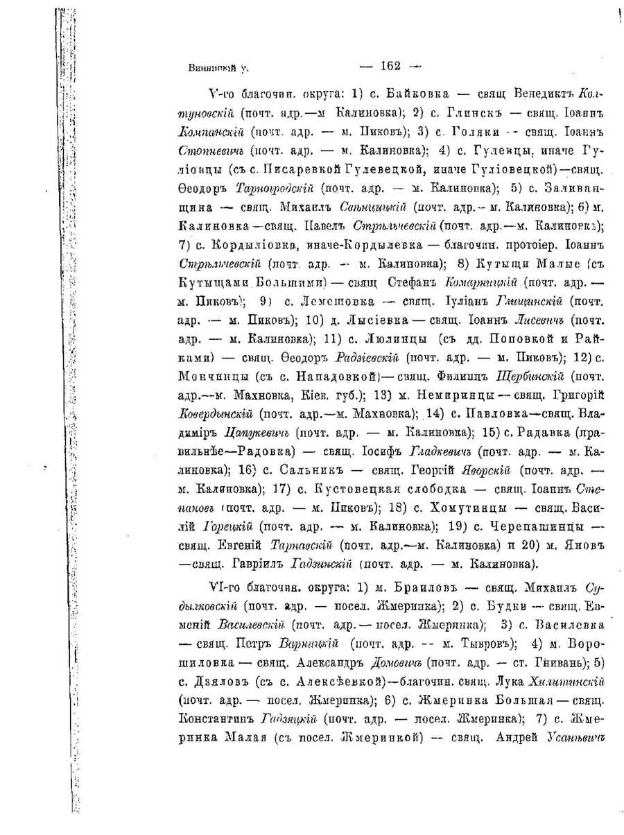 Cyrillic text: Виннишкий у. — 162 — И-го благочин. округа: 1) с. Байковка — свящ Венедикт Колтуновский (почт. адр.—м Кадиловка); 2) с. Глинск — свящ. Иоанн Компанский (почт. адр. — м. Пиков); 3) с. Голяки -- свящ. Иоанн Стопневич (почт. адр. — м. Калиновка); 4) с. Гулевцы, ипаче Гулиовцы (с с. ПисаревкойГулевецкой, иначе Гулиовецкоп)—свящ. Феодор Таргюгродскгй (почт. адр. — м. Калиновка); 5) с. Заливанщина — свящ. Михаил Свгънцицкий (почг. адр,-м. Калиновка); 6) м. Калиновка—свящ. Иапел Стрелъчевский (почт, адр.—м. Калинорц.г); 7) с. Кордылиовка, иначе-Кордылевка — благочин. протоиер. Иоанн Стрелъчевский (почт. адр. — м. Калиновка); 8) Кутыщи Малые (с Кутыниами Болыпими)— свящ Стефан Комарнгицкий (почт. адр.— м. Пиков); 9) с. Лемешовка — свящ. Иулиан ГлищгшскШ (почт. адр. — м. Пиков); 10) д. Лысиевка — свящ. Иоанн Лисевич (почт. адр. — м. Калиновка); 11) с. Люлинцы (с дд. Поповкой и Райками) — свящ. Феодор Радзиевский (почт. адр. — м. Пиков); 12) с. Мончинцы (с с. Нападовкой)—свящ. Филинл ЩербгинсгсШ (почт. адр.—м. Махновка, Киев, губ.); 13) м. Немиринцы — свящ. Григорий Ковердынский (почт. адр.—м. Махновка); 14) с. Павловка—свящ. Владимир Цапукевич (почт. адр. — м. Калиновка); 15) с. Радавка (лравильнее—Радовка) — свящ. Иосиф Гладкевич (почт. адр, — ы. Калиновка); 16) с. Сальник — свящ. Георгий Яворский (почт. адр. — м. Калиновка); 17) с. Кустовецкая слободка — свящ. Иоанн Степанов (почт. адр. — м. Ппков); 18) с. Хомутинцы — свящ. Василий Гореиький (почт. адр. — м. Балиновка); 19) с. ЧерепашинЦы — свящ. Евгений Тсирнавский (почт. адр.—м. Калиновка) и 20) м. Янов —свящ. Гавриил Гадзинский (почг. адр. — ы. Калиновка). ИИ-го блаточин. округа: 1) м. Браилов — свящ. Михаил Судылгжсгпй (лочт. адр. — посел. Жмериика); 2) с. Будки — свящ. Евмений Тасилевскгй (почт. адр.— посел. Жмерпнка); 3) с. Василевка — свящ. Петр Варшщкий (почт. адр. -- м. Тывров); 4) м. Ворошиловка — свящ. Александр Домовгич (почт. адр. — ст. Гнивань); 5) с. Дзялов (с с. Алексеевкой)—благочин. свящ. Лука Хилитгинский (почт. адр.— лосел. Жмерпнка); 6) с. Жмеринка Болыпая — свящ. Константин ГадзяцкШ (почт. адр. — посел. Жмеринка); 7) с. Жмеринка Малая (с посел. Жмеринкой) — свящ. Андрей Усанееичъ | Translated text: Vinnishky y. - 162 -