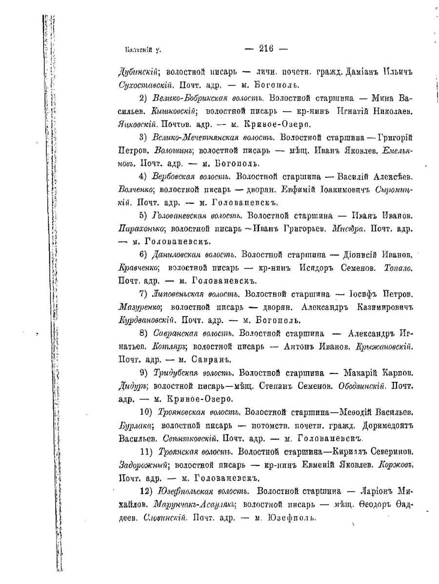 Cyrillic text: Валтекий у. — 216 — Дубгтскгй; волостной" писарь — личн. почетн. граЖд. Дамиан Нльич СухоставскШ. Почт. адр. — м. Богополь. 2) Велико-Бобрижская волость. Волостной старшина — Мина Васильев. Еишковский; волостной писарь — кр-нин Нгнатий Николаев. Яцковский. Почтов. адр. —• м. Кривое-Озеро. 3) Велико-Мечетнянская волость. Волостной старшина — Григорий Петров. Во.гошин; волостной писарь — мещ. Иван Яковлев. Емелъянов. Почт. адр. — м. Богополь. 4) Вербовская волост. Волостной старпиина — Василий Алексеев. Волченко; волостной писарь — дворян. Евфимий Иоакимович Сыромицкин. Почт. адр. — м. Голованевск. 5) Толованевская волость. Волостной старшина — Иван Иванов. Ларахонъко; волостноп ппсарь — Иван Григорьев, МггсгЪра. Почт. адр, — м. Голованевек. 6) Даниловская волость. Волостной старшина — Дионисий Иванов. Еравченко; волостной писарь — кр-нин Исидор Семенов. Топало. Почт. адр. — м. Голованевск. 7) Липовенъская волоспг. Волостнои старшина — Иосиф Петров, Мазуренко; волостной писарь — дворян. Александр Казимирович Еурдвановский. Почт. адр. — м. Богополь. 8) Савранская волость. Волостной старшина — Александр Игнатьев. Еотляр; волостной писарь — Антон Иванов. Ерыжатвский, Почт. адр. — м. Савран. 9) Тридубская фолость. ВолостноЙ старниина — Макарий Карпов. Дидур; волостной писарь—мещ, Степан Семенов. Ободзинский. Почт, адр. — м. Кривое-Озеро. 10) Трояновская волосгггь. Волостной стартина—Мефодий Васильев. Еурлака; волоетной писарь — потомств. почетн. гражд. Доримедонт Васильев. Свгьнтковский. Почт. адр. — м. Голованевск. 11) Троянская волость. Волостной старшина—Кирилл Северинов. Задорожный; водостной пйсарь — кр-нин Евмений Яковлев. Еоржов, Почт. адр. — м. Голованевск. 12) Юзефгголъская еолост. Волостной етаршина — Дарион Мнхайлов. Марунчак-Асау.ияк; волостной нисарь — ыещ. Феодор Фаддеев. С.говинскгй. Почт. адр. — м. ИОзефполь. | Translated text: Valteky y. - 216 -