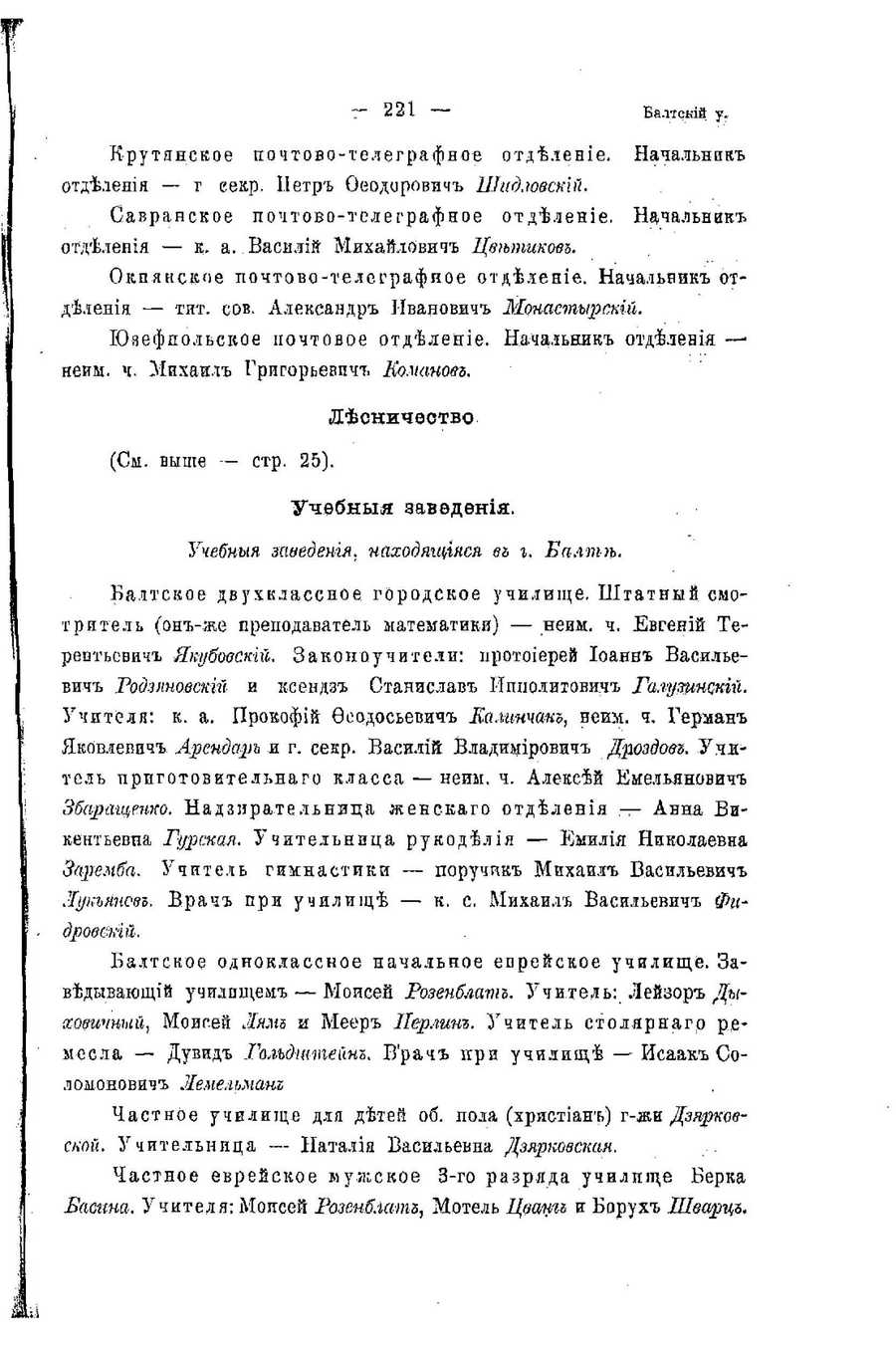 Text on the Chechelnik Books DatabaseCyrillic text: ~- 221 — Балтский у. Крутянское почтово-телеграфное отделение. Начальник отделения — г секр. Нетр Феодорович Шидловскиии. Савранское почтово-телеграфное отделение, Начальник отделения — к. а. Василий Михайлович Цветиков. Окнянскпе почтово-телеграфное отделение. Начальник отделения — тит. сов. Александр Нвановнч Монастырский. ИОзефпольское почтовое отделение. Начальник отделения —• неим. ч. Михаил Григорьевич Команов. Лесничфство (См. выше — стр. 25). Учфбныя завфдфния. Учебныя заведения. находящияся в и. Еалте. Ва.итское двухклассное городское училище. Штатный смотритель (он-же преподаватель математики) — неим. ч. Евгений Терентьевич ЯкубовскЫ. Законоучители: протоиерей Иоанн Васильевич Родзяновскт и ксендз Станислав Ипиолитович Галузинский. Учителя: к. а. Прокофий Феодосьевич Еа.шнчак, неим. ч. Герман Яковлевич Арендар и г. секр. Василий Владимирович Дроздов. Уяитель нриготовительнаго к.иасса — неим. ч. Алекеей Емельянович Збаращенко. Надзирательница женскаго отделения — Анна Викентьевна Гурская, Учительница рукоделия — Емилия Николаевна Заремба. Учитель гимнастики — поручик Михаил Васильевич Лукъянов. Врач при училище — к. с. Михаил Васильевич Фи~ дровский. Балтское одноклассное начальное епрейское училище. Заведывающий училищем — Моисей Розенблат. Учитель: Лейзор Дыховитый, Моиеей Жнм и Меер ИИер.тн. Учитель столярнаго ремесла — Дувид Голъдштейн. Врач при училище — Исаак Соломонович Жемелъман Частное училище для детей об. пола (христиан) г-жи Дзярковской. Учительница — Наталия Васильевна Дзярковская. Частное еврейское мужское 3-го разряда училище Берка Басина. У чителя: Моисей Розеиб.шт, Мотель Цваж и Борух Шварц. | Translated text: ~ - 221 - balta y.