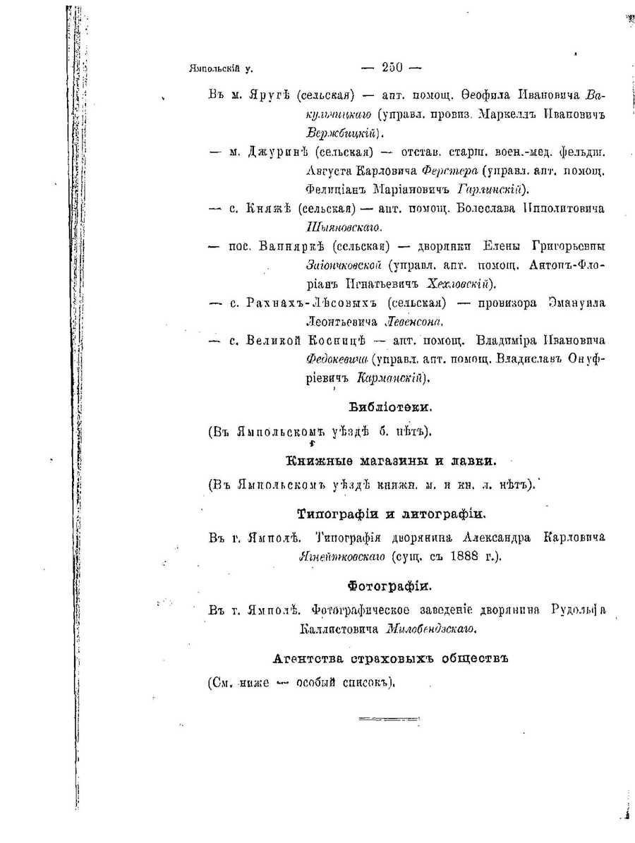 Text on the Chechelnik Books DatabaseCyrillic text: Ялпольский у. — 250 — В ы. Яруге (сельская) — апт. помощ. Феофпла Ивановича Вакилъчицкаго (управл. провпз. Маркелл ИИванович Вержбгщкий). — м. Джурине (сельская) — отстав. старга. воен.-мед. фельдш. Августа Карловича Ферстера (управл. апт. помощ. Фелициан Марианович Гарлгтскиа). — с. Княже (сельская) — апт. помощ. Болеслава ИИпполитовича Шыяновскаго. — пос. Вапнярке (сельская) — дворянкп Елены Григорьевны Заиончковской (ушравл. апт. помощ. Ант.он-Фдориан Игнатьевич Хехловскгй). — с. Рахнах-Лесовых (сельская) — провязора Эмануила Леонтьевича Жевенсона. — с. Великой Коснпце — апт. помощ. Владимира Ивановича Федокевича (управл, апт. помощ. Владислав Онуфриевич КарманскЫ). Библиотфки. (В Яыпольскоы уезде б. нет). Книзкныф магазйны и лавки. (В Яыпольском уезде княжн. м. п кн. л. нет)." Тилографии и литографии. В г, Ямполе. Типография дворянина Александра Карловича Яшенгпковскаго (сущ. с 1888 г.). Фотографии. В г. ЯмполЕ. Фотографическое заведение дворяннна Рудолыиа Каллпстовича Милобендзскаго. Агентства страховых обществт. (См. -ниже — особый список). | Translated text: Yalpolsky y. - 250 -