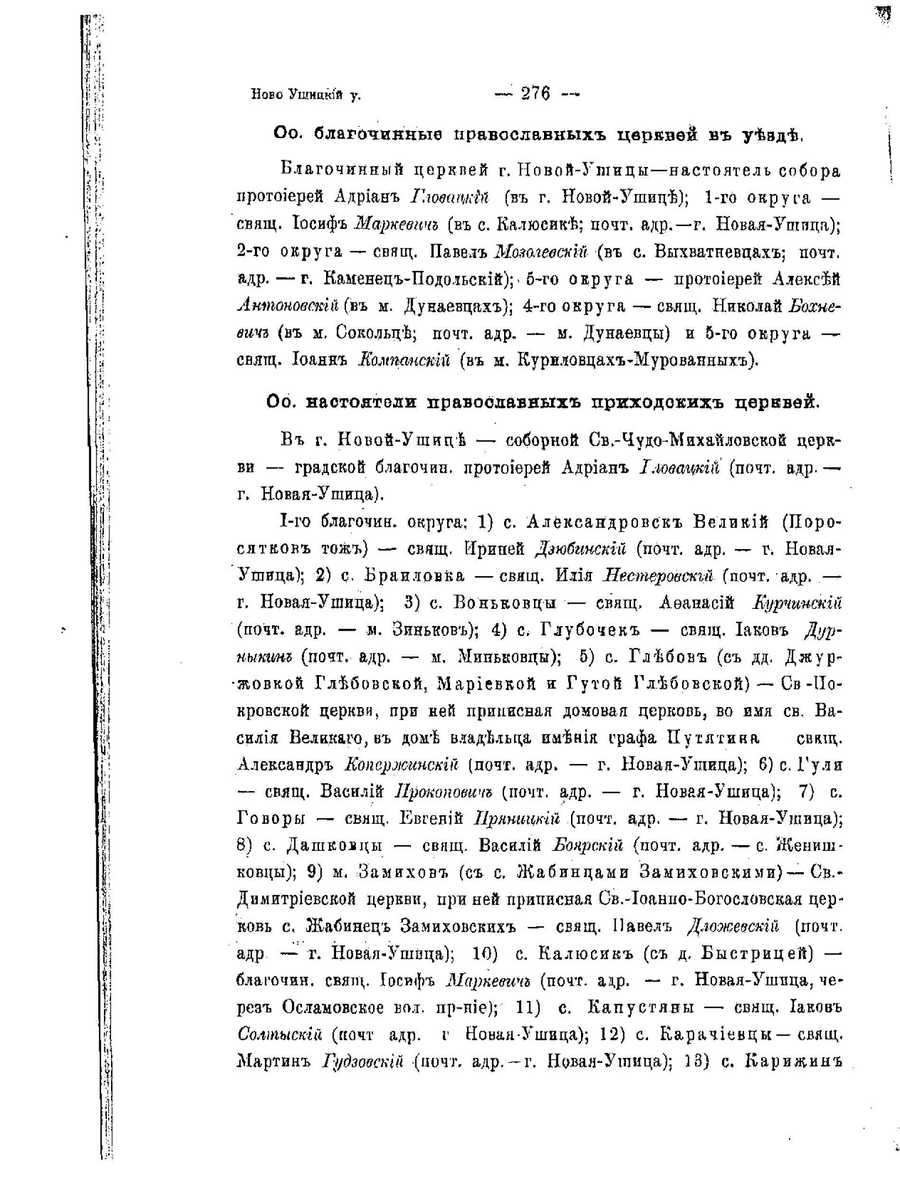 Cyrillic text: Ново Ушицкий у. — 276 — Оо. благочинныф православных цврквфй в уевде. Благочинный церквей г. Новой-Ушицы—настоятел собора протоиерей Адриан ГювацкЫ (в г. Новой-Ушице); 1-го округа — свящ. Иосиф Маркевич (в с. Калюсике; почт. адр.—г. Новая-Ушпца); 2-го округа — свяпи. Павел Мозолевский (в с. Выхватневцах; почт. адр.—г. Каменец-Подольский);• 5-го округа — протоиерей Алексей Антоновский (в м. Дунаевцах); 4-го округа — свящ. Николай Бохневич (в м. Сокольце; почт. адр. — м. Дунаевцы) и 5-го округа — свящ. Иоаян Компанский (в м. Куриловцах-Мурованных). Оо. наотоятеди правоолавных приходоких цфрквфй. В г. Новой-Ушице — соборной Св.-Чудо-Михайловской церкви — градской благочип. протоиерей Адриан Иловацкиии (почт. адр. — г. Новая-Ушйца). И-го благочин. округа: 1) с. Александровск Великий (Поросятков тож) — свящ. Ириней Дзюбинский (почт. адр. — г. НоваяУшица); 2) с. Браиловка — свящ. Илия Нестеровскъй (почт. адр. — г. Новая-Ушица); 3) с. Воньковцы — свящ. Афанасий Курчинский (почт. адр. — м. Зиньков); 4) с. Глубочек — свящ. Иаков Дурныкин (почт. адр. — м. Миньковцы); 5) с. Глебов (с дд. Джур•жовкой Глебовской, Мариевкой и Гутой Глебовской) — Св-Покровской церкви, при ней приписная домовая церковь, во имя св. Василия Великаго, в доме владельца имения графа Путятина свящ. Александр Копаржинский (почт. адр. — г. Новая-Ушица); 6) с. Гули — свящ. Василии ИИрокопович (почт. адр. — г. Новая-Ушица); 7) с. Говоры — свящ. Евгений Пряшщкий (почт. адр. — г. Новая-Ушица); 8) с. Дашковцы — свящ. Василий Боярский (почт. адр. — с. Женишковцы); 9) м. Замихов (с с. Жабинцами Замиховскими)—Св.Димитриевской церкви, при ней приписная Св.-Иоанно-Богословская церковь с. Жабинец Замиховских — свящ. Павел Дложевский (почт. адр — г. Новая-Ушпца); 10) с. Калюсик (с д. Быстрицей) — благочин. свящ. Иосиф Маркевич (почт. адр. — г. Новая-Ушица, через Осламовское вол. пр-пие); 11) с. Капустяны — свящ. Иаков Со.ипыский (почт адр. г Новая-Ушица); 12) с. Карачиевцы— свящ. Мартин Гудзовский (почт. адр. — г. Новая-Ушица); 13) с. Карижинъ | Translated text: New Ushitsky y. - 276 -