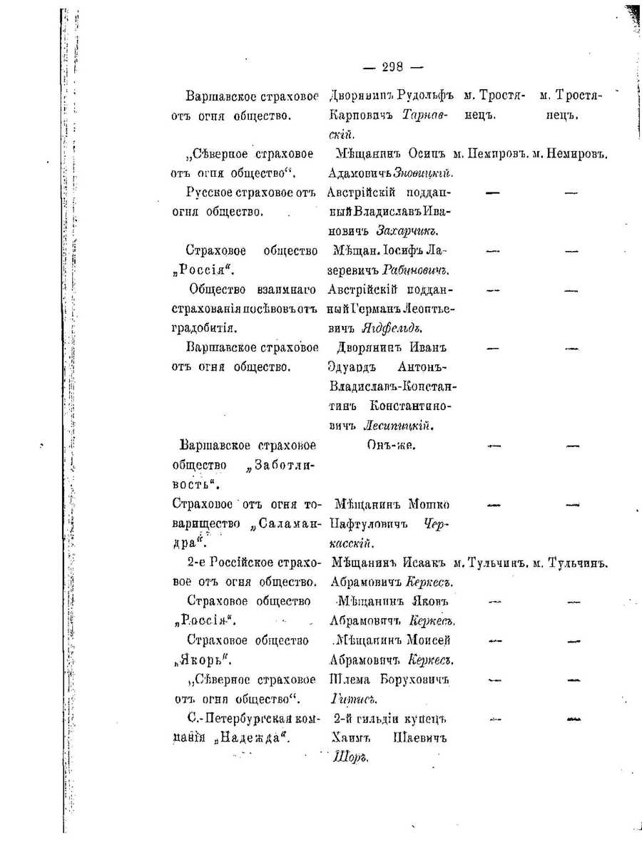 Text on the Chechelnik Books DatabaseCyrillic text: — 298 — Баршавское страховое от огня общество. „Северное страховое от огня общество". Русское страховое от огня общество. Страховое общеетво „Россия*. Общество вэапмнаго страхования посевовъот градобития. Варшавекое страховое от огня общество. Варшавское страховое общество „Заботлнвость". Страховое " от огня товарнщество „СаламанДра*." 2-е Российское страховое от огня общество. Страховое общество „Р.оосий". Страховое общество „Якорь". „Оеверное страховое от огнл общество". С.-ПетербургскаЯ комнайин „Надежда"?. Дворянип Рудольф м. Тростя- м. ТростяКарпович Тарнав- нец. пец. скгй. Мещанин Осип м. Немпров. м. Немиров, АдамовичъЗжшнй"гЛ. Австрийский поддан- — — иыйВладислав Иванович Захарчгш. Мещан. Иосиф Ла- — — зеревич Рабгтович. Австрийскиии поддан- — — ны й Герман Л еонтъевич Ягдфельд. Дворянин Иван — — Эдуард АнтонъВдадислав-Копстантин Константинович Лесишщкш, Он-ике. — — Мещанпн МошкО — — Нафтулович Черкасскш. Мещанин Исаак м. Тульчин, м. Тульчин. Абрамович Керкес. •Мещанин Яков — — Абрамович Керкес. .Мещанин Моисе.й — — Абрамович Керкес. ПТлема Борухович — — Ииптс. 2-й гйльдии куяец — — Хаим ПИаевич " Шор. | Translated text: - 298 -