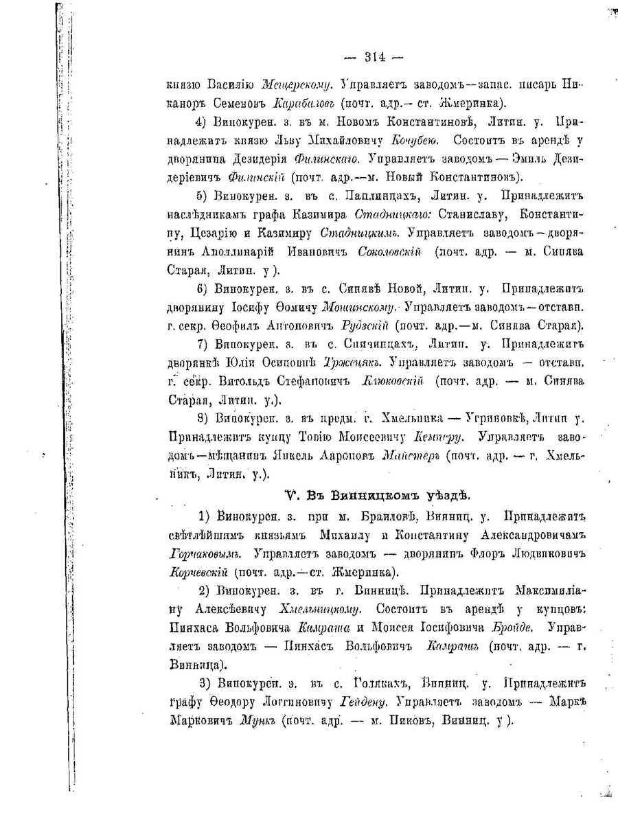 Cyrillic text: — 314 впязю Василию Мсщерскому. Управляет заводомъ—запас. писарь Никанор Семенов ИИарабалов (почт. адр.— ст. Жмеринка). 4) Винокурен. з. в м. Новом Константинове, Лжтин. у. Нрннадлежит князю Льву Михайловичу Кочубею. Состоит в аренде у дворянина Дезидерия Филинскаго. Управляет заводом — Эмиль Дезидериевич Филинский (почт. адр.—м. Новый Константпнок). 5) Винокурен. з. в с, Паплинцах, Литин. у. Принадлежит наследнпкам графа Казимира Стадницкахо: Станиславу, Константину, Цезарию и Казимиру Сгпадницким. Управляет заводомъ—дворянин Аполлинарий Иванович Соколовский (почт. адр. — м. Сипява Старая, Литин. у). 6) Винокурен. з. в с. Сипяве Новой, Литин. у. Принадлежпт днорянину Иосифу Фомичу Мошинскому.- Управляет заводомъ—отставн. г. секр. Феофил Аптонович Рудзскин (почт. адр.—м. Сннлва Старая). 7) Винокурен. з. в с. Спичинцах, Литнп. у. Припадлежит дворянке ИОлии Осиповне Тржецяк. Уиравляет заводом — отставн. гГ сёвр. Вятольд Стефапоиич Иилюковский (почт. адр. — м. Синява Старая, Литин. у.). 8) Вияокурен. з. в нредм. г. Хмельпива — Угрянопке, Лптин у. Пранадлежит кунцу Товию Моисесвичу Мемперу. Уяравляет заводом — ыещанпнт. Япкель Аароиов Майстер (почт. адр. — г, Хмельниик, Лптин, у.), V. В Винницком уезде. 1) Винокуреа. з. при м. Браилове, Винниц. у. Прпнадлежит. свЕтлейшим князьям Михаилу и Констаптину Александровичам Горчаковым. Управляет заводом ,— дворянин Флор Людвпковнч Морчевский (почт. адр.—ст. Лимеринка). 2) Винокурен. з. в г. Впннице. Припадлежпт Макспмилиану Алексеевичу Хмельницкому. Состонт в аренде у купцовъ: Пинхаса Вольфовича Камраша и Мопсея Иоспфовича Бройде. Управляет заводом — Пияхас Вольфовпч Ииамраги (почт. адр. — г. Винвица). 3) Винокуреи. з. в с. Голяках, Вппннц. у. Прпнадлежит графу Феодору Логгпновпчу Гейдену. Упрайляет заводом — Марк МарКович Мунк (почт. адр. — м. Пиков, Винниц. у). | Translated text: - 314 vpyazyu Basil Msscherskomu. Manages zavodom-stock. scribe Nicanor IIarabalov Semenov (pocht. addr. - art. Zhmerynka).