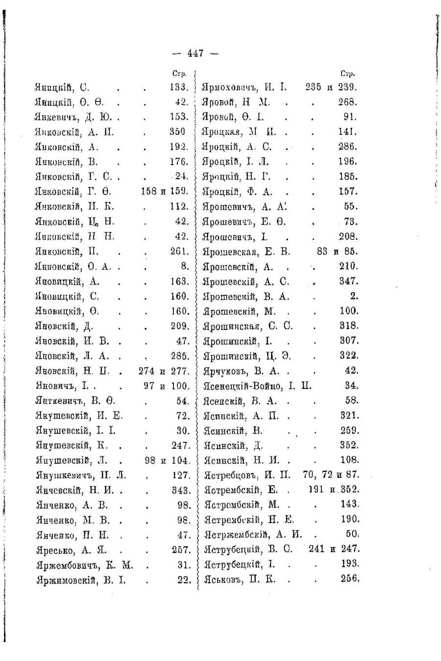 Cyrillic text: - 447 Стр. 5 Стр. Янпцгсий, С. 133. Ярмоховиич, И. I. 235 и 239. Янпцкий, Ф. Ф. 42. • Яровой, Н М. 268. Янкевич, Д. Ю. . 153. , Яровоии, Ф. I. 91. Яиковский, А. II. 350 " Яроцкая, 11 И. . 141. Яиковскип, А. 192. Яроцкий, А. С. 286. Янковскиии, В. 176. Яроцкий, I. Л. 196. Янковский, Г. С. . .24. Яроцкий, Н. Г. 185. Янковский, Г. Ф. 158 и 159. Яроцкий, Ф. А. 157. ЯнковскШ, II. К. 112. Ярошевич, А. А". 55. Янковский, Ии, Н. 42. Ярошевич, Е. Ф. 73. Янковскип, Н Н. 42. Ярошевич, I. 208. Янковский, Н. 261. Ярошевская, Е. В. 83 и 85. Янковский, Ф. А. . 8. Ярошевский, А. 210. Яновицкий, А. 163. Ярошевский, А. С. 347. Яновицкий, С. 160. Ярошевский, В. А. 2. Явовицкий", Ф. 160. Ярошевский, М. 100. Яновский, Д. 209. Ярошинская, С. С. 318. Яновский, И, В. . 47. Ярошинский, I. 307. Яновский, Л. А. . 285. Ярошинский, II. Э. 322. Явовский, Н. П. . 274 и 277. Ярчуков, В. А. . 42. Янович, I. . 97 и 100. Ясенецкий-Войно, I. П. 34. Янткевич, В. Ф. 54. 1 Ясенский, В. А. . 58. Янушевский, И. Е. 72. ЯСИНСКИЁ, А. П. . 321. Янушевский, I. I. 30. 1 Ясинский, В. 259. Янушевекий, К, . 247. ; Ясинский, Д. 352. Яиушевский, Л. . 98 и 104. ( Ясинский, Н. И. . 108. Янушкевич, Н. Л. 127. Ястребцов, И. П. 70, 72 и 87. Янчевский, Н. И. . 343. > Ястрембский, Е. . 191 и 352. Янченко, А. В. . 98. } Ястрембский, М. . 143. Янченко, М. В. . 98. Ястрембский, Н. Е. 190. Янченко, П. И. . 47. Ястржембский, А. И. . 50. Яресько, А. Я. 257. и Яструбецкий, В. С. 241 и 247. Яржеыбович, К. М. 31. Яетрубецкий, I. 193. Яржимовский, В. I. 22. | Яськов, П. К. 256, | Translated text: - Page 447. Page 5.