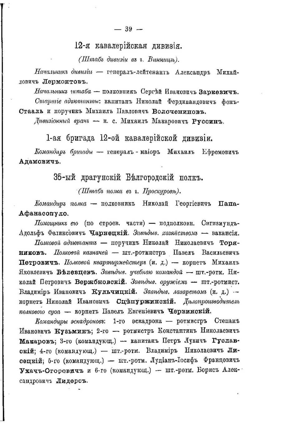 Text on the Chechelnik Books DatabaseCyrillic text: — 39 12-я кавалерийокая дивизия. (ИНтаб дгтити в г. Виннмце). Началъник дивизги — генерал-лейтенант Алевсандр Михайлович Лермонтов. Иачалънж штаба — полковник Сергей Иванович Заркфвич. Отаршие адъютанты: каиштан Николай Фердинандович фонъСтааль и поручик Михаил Павлович Водоченинов. Дивизионный врач — к. с. Михаил Макарович Русеин. 1-ая бригада 12-ой кавалерийекой дивизии. Еомандир бригады — генерал - маиор Михаил Ефремович Адамович. 35-ый драгунский Белгородский полк. (ПИтаб полка в г. Проскурове). Еомандир еолка — полковник Николай Георгиевич ПапаАфанаеопуло. Помощник его (по строев. части) — подполковн. СигизмундъАдольф Феливсович Чарнфцкий. Заведыв. хозяйсшом — вакансия. Полковой адъютант — поручик Ниволай Николаевич Торяников. Полковой казначей — шт.-ротмистр Павел Васильевич Лфтровнч. Полковой квартирмегистер (и. д.) — корнет Михаид Яковдевич Белевцфв. Заведъш. учебною командой — шт.-ротм. Николай Петрович Вфржбновский. Заведъш. оружием — шт.-ротмист. Владимир Иванович Кульчицкий. Заведыв. лазаретом (и. д.) •корнет Никодай Иванович Сцепуржинсжий. Делопроизводит&г полкового суоа — ворнет Павел Евгениевич Чфрвинсвий. Ёомандиры фскадроноеъ: 1-го эекадрона — ротмистр Степан Йванович Кузьмин; 2-го — ротмистр Еонстантин Николаевич Макаров; 3-го (командуюш,.) — капитан Петр Лукич Гуславский; 4-го (командующ.) — шт.-ротм. Владимир Ниволаевич Лисфцкий; 5-го (командующ.) — шт.-ротм. Луциан-Иосиф Францович Ухач-Огорович и 6-го (командующ.) — шт.-ротм. Борис Александрович Лидерс. | Translated text: - 39 The 12th Division kavaleriyokaya.