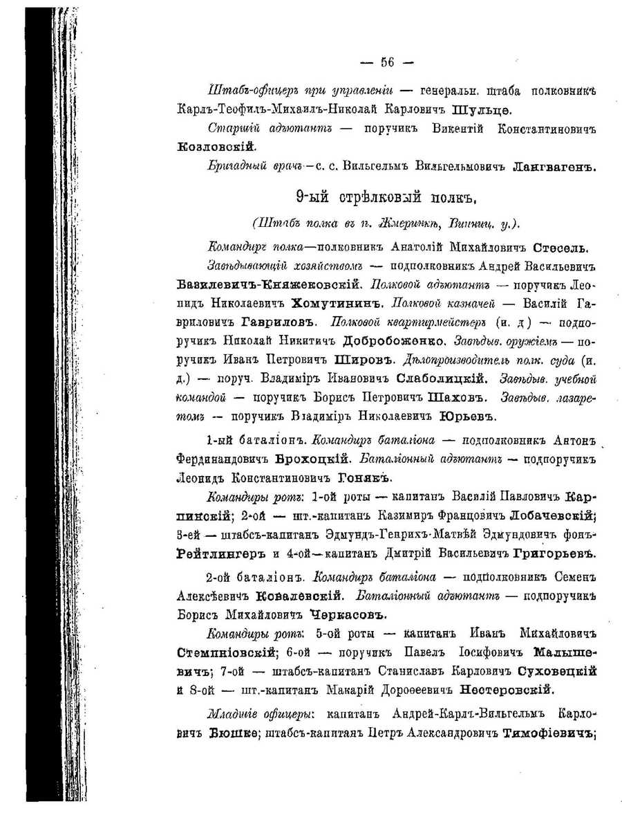 Text on the Chechelnik Books DatabaseCyrillic text: — 56 — Штабг-офицерг при управлении — генеральн. штаба полковнйк Карл-Теофил-Михаил-Николай КарлОвич Шулъцф. Старший адъютатп — поручик Викентий Константинович Козловекий. Бригадный врачъ—с. с. Вильгелыи Вильгедьыович Лангвагфн. 9-ый стрелковый полк, (НИтпб полка в е. Жмерите, Лгшниц. у,). Командирг полка—полковник Анатолий Михайлович Стфеель. Заведывающий хозяйством — подполковник Андрей Васильевич Базилфвич-Князкфковский. Лолковой адъютант — поручик Леонид Николаевич Хомутинин. Полковой казначей — Василий Гаврплович Гаврилов. Полковой квартиьрмейстер (и. д) — подпоручик Николай Никитич Добробоэкфнко. Заведыв. оружгем — поручик Иван Петрович Широв. Делопроизводител полк. суда (и. д.) — поруч. Владиыир Иванович Слаболицкий. Затъдыв. учебной командой — поручик Борис Цетрович Шахов. Заведыв. лазаретом — поручик Виадимир Николаевич Юрьев. 1- ый баталион. Командирг баталиона — подполковник Антон Фердинандович Брохоцкий. Баталионный адъютант — подпоручик Леонид Консгантинович Гоняк. Командиры ротъ\ 1-ой роты — капитан Василий Павлович Карпинский; 2-ой — шт.-капитан Казимир Францович Лобачфвский; 3-ей — штабс-капитан Эдмунд-Генрих-Матвей Эдмундович фонъРфйтлингфр и 4-ой—капитан Дмитрий Васильевич Григорьев. 2- ой баталион. Командирг баталиона — подполковник Семен Алексеевич Ковалфвский. Баталионный адъютант — подпоручике Борис Мйхайлович "Чфркасов. Еомандиры ротъ: 5-ой роты — капитан Йван Михайдович Стемпниовский; 6-ой — поручик Павел Иосифович Малышфвич; 7-ой — штабс-капитан Станислав Карлович Суховецкий й 8-ой — шт.-капитан Макарий Дорофеевич Нестфровский. Жтдшие офицеры: капитан Андрей-Карл-Вильгельм КарлоВич Бюшкф; штабс-капитан Петр Александрович Тямофифвич; | Translated text: - 56 -
