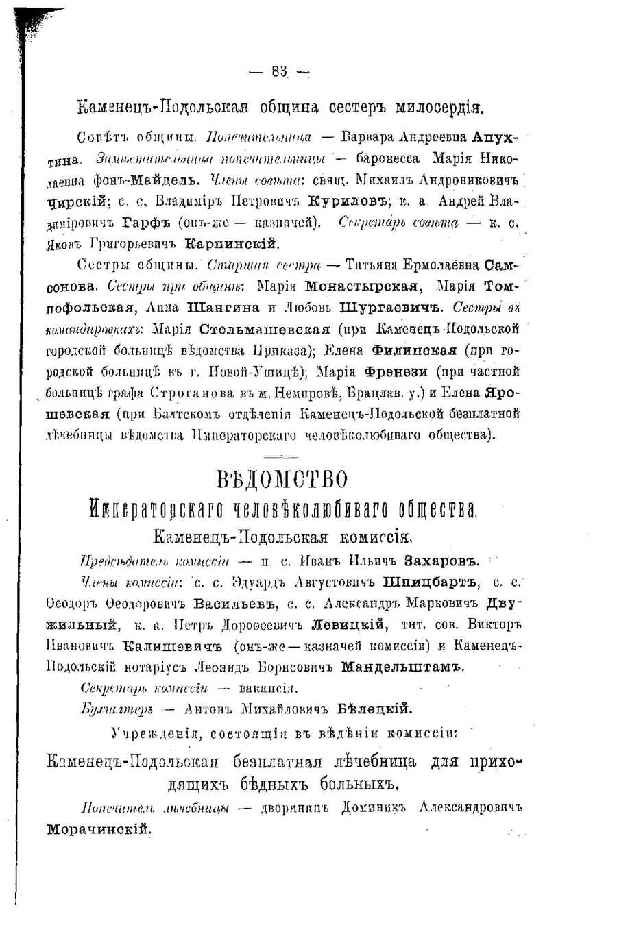 Cyrillic text: — 83. Камеиец-Подольокая. община сеотер милооердия, Сог.ет общины, Лоииеч/итс.итинд — Варвара Андреевпа Апухтина, Замиытииипелъншии попсчнтс.иьницы "— баронесса Мария Николаевна фон-Майдел. Члены совета: свящ. Михаил Андроникович " Чирский; с. с. Владимир Петрокпч Курилов; к. а. Андрей Владиаирович Гарф (он-же — каапачей). Секретарь совиыгт — к. с. Якои Григорьевич Карпинский. Сестры общины. Старшая сстра — Татьяна Ермолаёвна Самсонова. Сестры при обишне: Мария Монастырская, Мария Томпофольская, Апна Шангяна и Любовь Шургафвич. Сестры в ио.иандиравтт: Мария Стфльмашфвская (иири Каменец-Подол.ьской городскоии бо.иьнице ведомства Приказа); Елена Филипская (при городсгсой больнице и г. НовоГи-Ушице); Мария Френфзи (при частной больнице графа Строганова в м. Неиирове, Брацлав. у.) и Елена Ярошевская (при Балтском отделенип Каменец-Подольской безплатноии лечебницы иедомстаи Пмператорскаго чедовеколюбцваго общества). ВЕДОМСТВО Ишртозсшо человеколюОиваго общества, Каменец-Подолъская комигсия. Лредседате.е комиссии — н. с. Ивап Ильич Захаров. И.и&ны комиссш: с. с. Эдуард Августовпч Шпицбарт, с. с. Оебдор Феодоровпч Васильев, с. с. Александр Маркович Двужильный, к. а. Пстр Дорооеевич Лфвицкий, тит. сов. Виктор Ииванович Калишевич (он-же — казначеии комиссии) и КаменецъИиодольскиГи нотариусь Леонид Борисович Мандельштам. Секрстари, комиссии — вакансил. Бухшлтер — Антон Михаплович Белецкий. Учреж-дения, соетоягция в ведении комиссии: Каменец-Подольская безплатная лечебница для приходящих бедных больных, Лопечипшь лечсбницы — дворяншгь Доминпк Александрович Морачинский. | Translated text: - 83.
