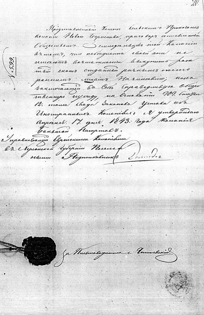 Letter to the Novorussia and Bessarabia General Gubernator Vorontsov from the Novo Berislav (Novyj Berislav) colony colonists petitioning for help due to the bad harvest conditions.
