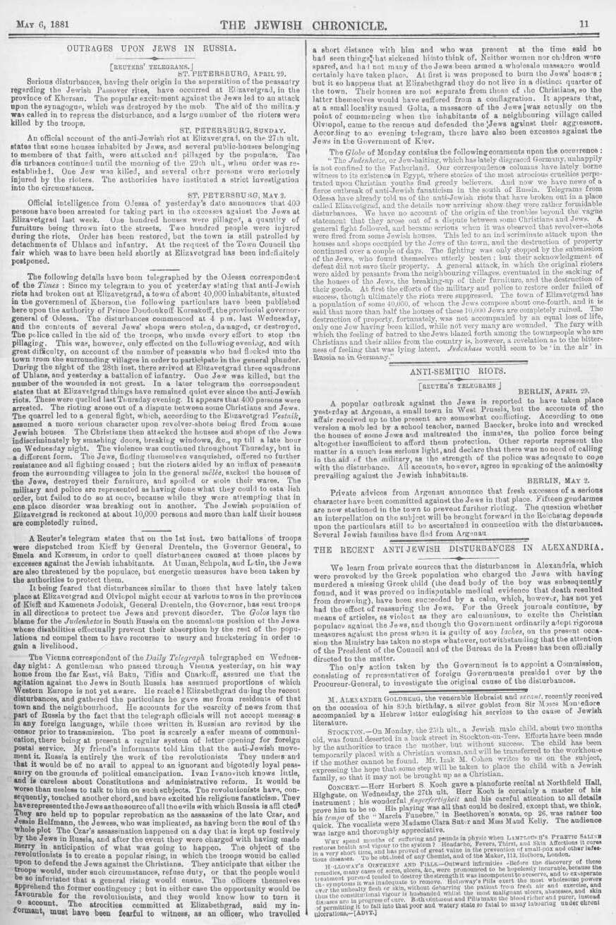 Articles in The Jewish Chronicle (London) describing pogroms in Russia, May 1881