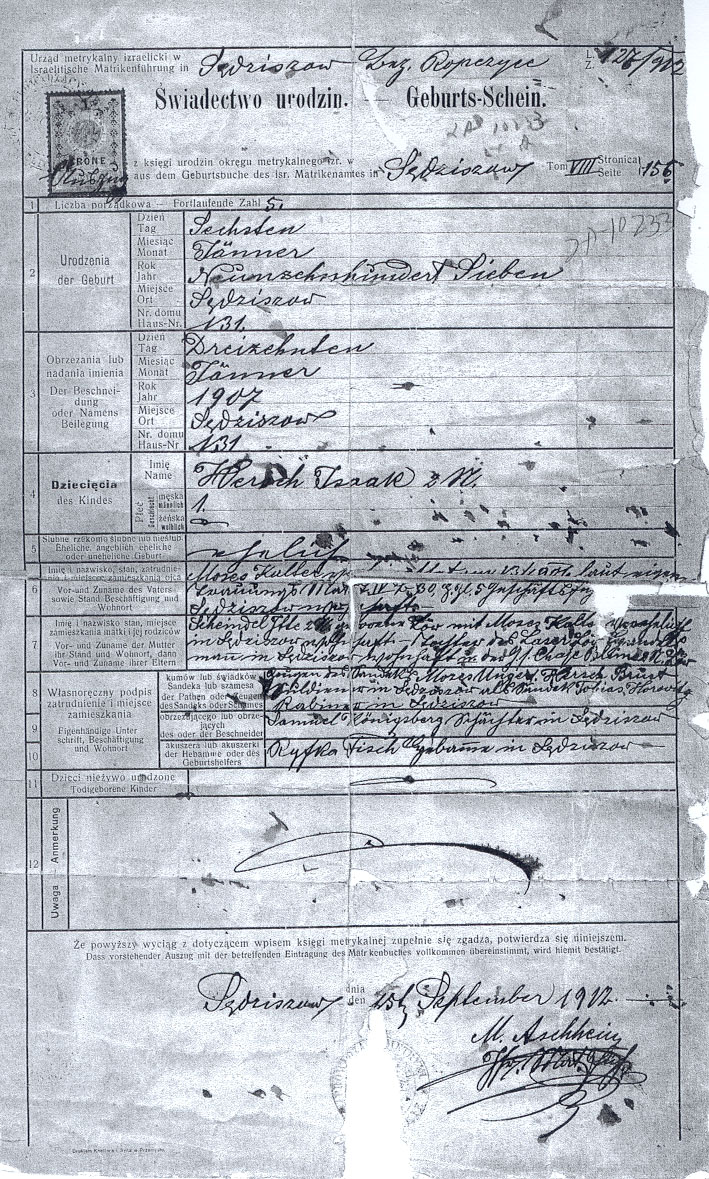 Birth Certificate of Henry ( Hersh Isaak) Kalter. Submitted by Judith Kalter Ritter