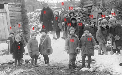 The whole school posed with two of the sponsors - (1) the woman at left next to school building and (9) the man at center of back row . (13) Mr. Smidt, owner of the mill and electric station , is on the right side of the back row with his head missing. (4) Solomon Gershuny , co-founder of the school, is in the back row, next