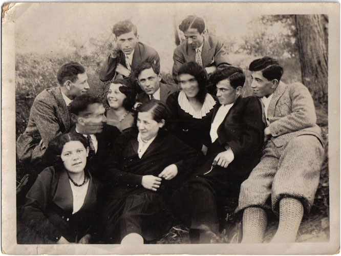 Second row (from right to left): Masha Lubitz (third), Saul Rotberg (fourth), Sonia Rochkin (fifth). Back row: Faivush Kuperfenig (left)
