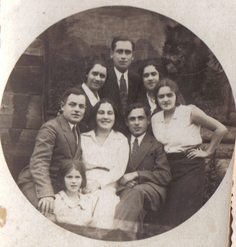 Front row (right to left): Saul Rotberg, Chana Belke (Rotberg) Lidski, Avraham Rotberg, the girl in front of them is their daughter. Back row (right to left): Fanya Berachowicz, Liza Berachowitz, unidentified, Etel Berachowicz