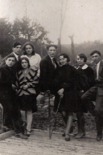 From right to left: Yosel Kagan, Sonia Rochkin, Yehudit Eliasberg, Yitzchak Alperstein, Fanya Berachowicz (with long hair), Faivush Kuprsfenig. In front of Fanya and Faivush are: Henie Gurevitz-Borovik and Saul Rotberg.