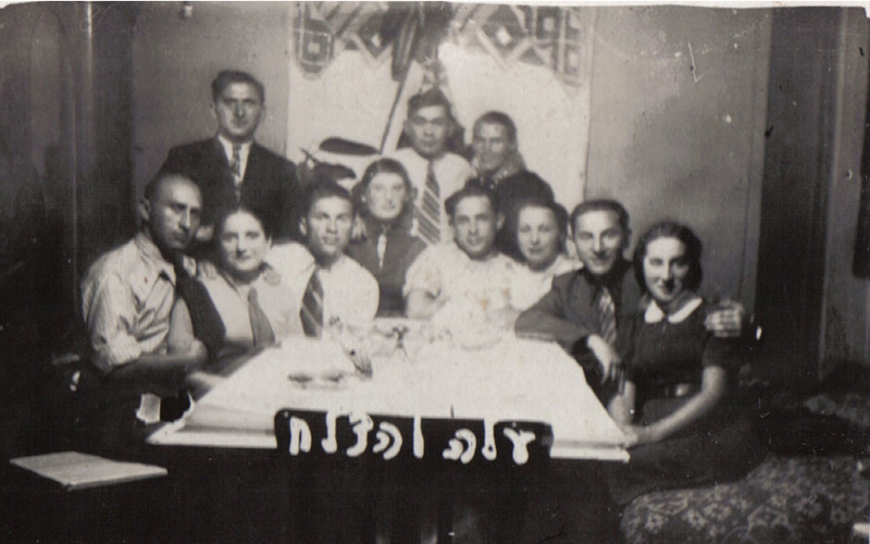 Sitting (right to left): Liza Arkin, two unidentified, Saul Rotberg, Chaya Eliashberg, Faivush Kuperfenig, two unidentified. Standing (right to left): Elka Pluskalowski, Zeev Zlotoyabko, unidentified