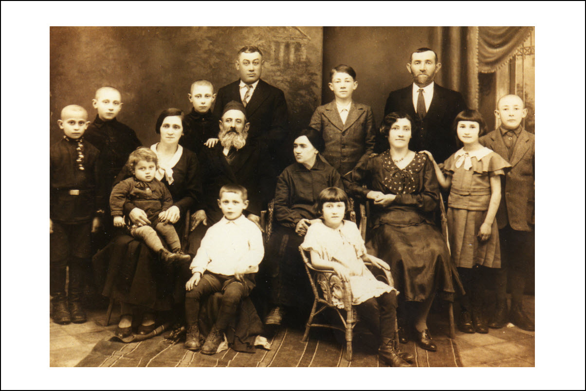 [2] Four Generations of the Shulman family: Middle row (left to right): Pearl Malka Shulman, her mother, Rivka (Gruber) Demb, her father Israel Jacob Demb, her husband Tsodik Shulman, her son-in-law, Saul Meiler. Back row (left to right) Pearl's son, Simon Shulman, son-in-law Shia Koszhushner, daughter Liza Koszhushner, son Ertz Shulman and daughter Nachuma Meiler. Front row (left to right), daughter Clara Shulman, granddaughter Tamara Meiler, daughter Pauline Shulman, daughter Sarah Shulman. ↩