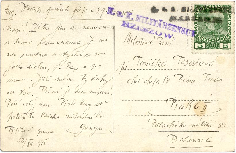 There is a Jaslo stamp: K.a.K Militarzensur, Rzeszow: Military Censor's Stamp