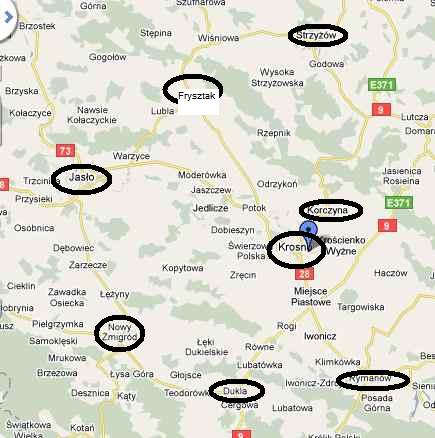 The cities and towns surrounding Strzyzow are (clockwise): Rzeszow (15 miles North), a very important Jewish city, Czudec (6 miles North), Tyczyn (12 miles East), Blazowa (13 miles East), Niebylec (4 miles East), Domaradz (9 miles SE), Lutcza (6 miles SE), Jasienica Rosielna (10 miles SE), Korczyna (10 miles South), Krosno (13 miles South), Jedlicze (12.3 miles South), Jaslo (17 miles West), Frysztak (8 miles West), and Wisniowa (6 miles West).