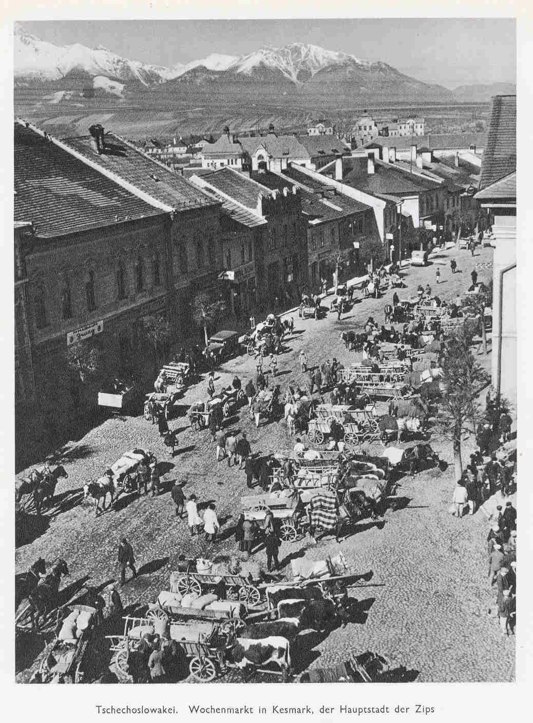 An image of the photo below was sent to Rina and Shaul GASSNER (relatives of the webmaster of this site) who had lived in Kezmarok pre-WW II, but emigrated to Israel. The following is a translation from the Hebrew of the description of Market Days in Kezmarok from their letter dated, 1 September 2008.