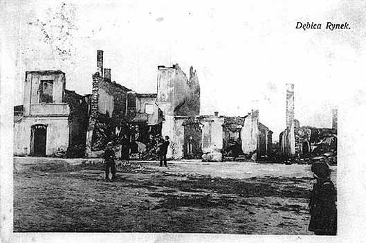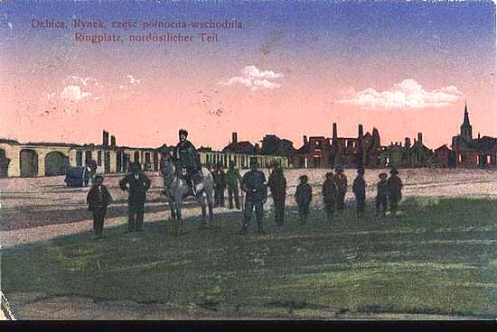 Dêbica Market Place showing damage from WW1. Printed by H.Hauser -