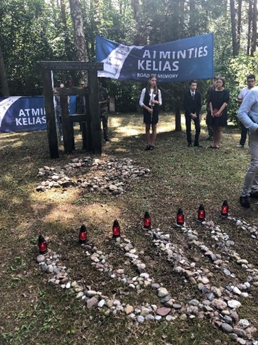 In the second part of this activity, the students attended a memorial ceremony at the mass murder site which is adjacent to the old Jewish cemetery of Mažeikiai. Names of the 24 high school students and four teachers of the gymnasium who were murdered during the Holocaust were read. The participating students wrote the names of the murdered high school students on pebbles and quietly laid them on the stone Menorah on the ground in front of the memorial monument (see photo below).