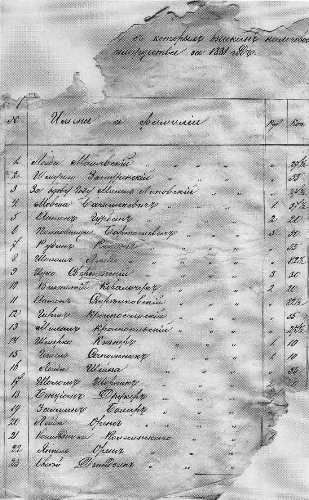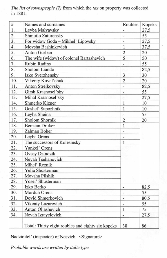 1881 Nesvizh Tax Payment list. To see the full document, place the arrow of your mouse on the image and press
