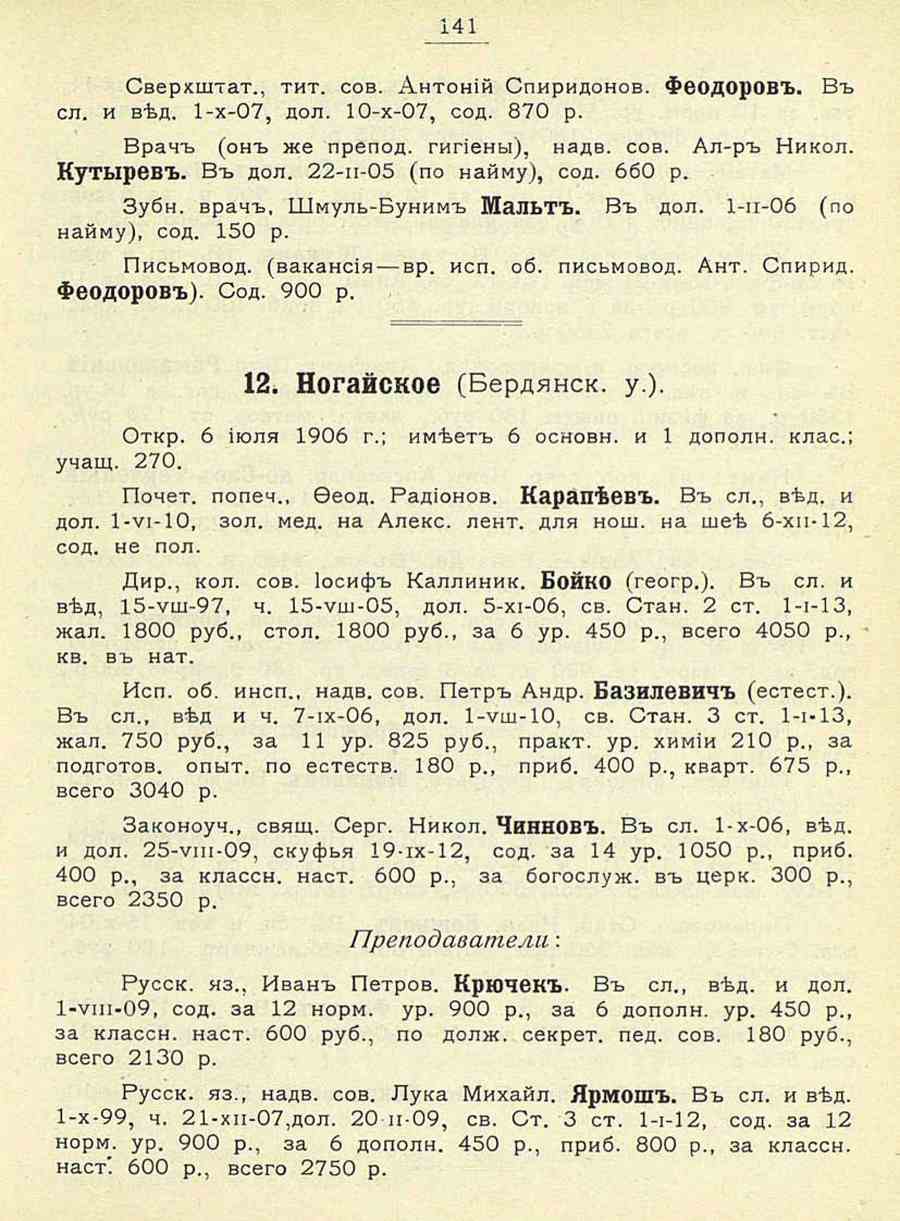 Cyrillic text: 141 Сверхштат., тит. сов. Антоний Спиридонов. ФфоДОрОВ. В сп. и вед. И-х-07, дол. ИО-х-07, сод. 870 р. Врач (он же препод. гигиены), надв. сов. Ал-р Никол. Кутырев. В дол. 22-П-05 (по найму), сод. 660 р. Зубн. врач, Шмуль-Буним Мальт. В дол. 1-п-Об (по найму), сод. 150 р. Письмовод. (вакансия— вр. исп. об. письмовод. Ант. Спирид. Феодоров). Сод. 900 р. 12. Ногайское (Бердянск. у.). Откр. 6 июля 1906 г.; имеет 6 основн. и 1 дополн. клас; учащ. 270. Почет. попеч., Феод. Радионов. Карапеев. В сл., вед, и дол, И-ии-10, зол. мед. на Алекс. лент. для нош. на шее б-хп-12, сод. не пол. Дир., кол. сов. Иосиф Каллиник. БоЙКФ (геогр.). В сл. и вед, 15-иш-97, ч. 15-иш-05, дол. 5-хи-06, св. Стан. 2 ст. И-и-ИЗ, жал. 1800 руб., стол. 1800 руб., за 6 ур. 450 р., всего 4050 р., кв. в нат. Исп. об. инсп., надв. сов. Петр Андр, БЭЗИЛФВИЧ (естест.). В сл., вед и ч. 7-их-06, дол. И-иш-10, св. Стан. 3 ст. И-и-ИЗ, жал. 750 руб., за 11 ур. 825 руб., практ. ур. химии 210 р., за подготов. опыт. по естеств. 180 р., приб. 400 р., кварт. 675 р., всего 3040 р. Законоуч., свящ. Серг. Никол. ЧИННОВ. В сл. И-х-06, вед. и дол. 25-ИШ-09, скуфья 19-их-12, сод. за 14 ур. 1050 р., приб. 400 р., за классн. наст. 600 р., за богослуж. в церк. 300 р., всего 2350 р. Преподаватели: Русск. нз., Иван Петров. КрЮЧФК. В сл,, вед. и дол. 1-ИШ-09, сод. за 12 норм. ур. 900 р., за 6 дополн. ур. 450 р., за классн. наст. 600 руб,, по долж. секрет. пед. сов, 180 руб., всего 2130 р. Русск. яз., надв, сов. Лука Михайл. ЯрмоШ. В сл. и вед. И-х-99, ч. 21-хп-07,дол. 20 п-09, св. Ст. 3 ст. 1-и-12, сод. за 12 норм. ур. 900 р., за 6 дополн. 450 р., приб. 800 р., за классн. наст* 600 р., всего 2750 р. | Translated text: 141