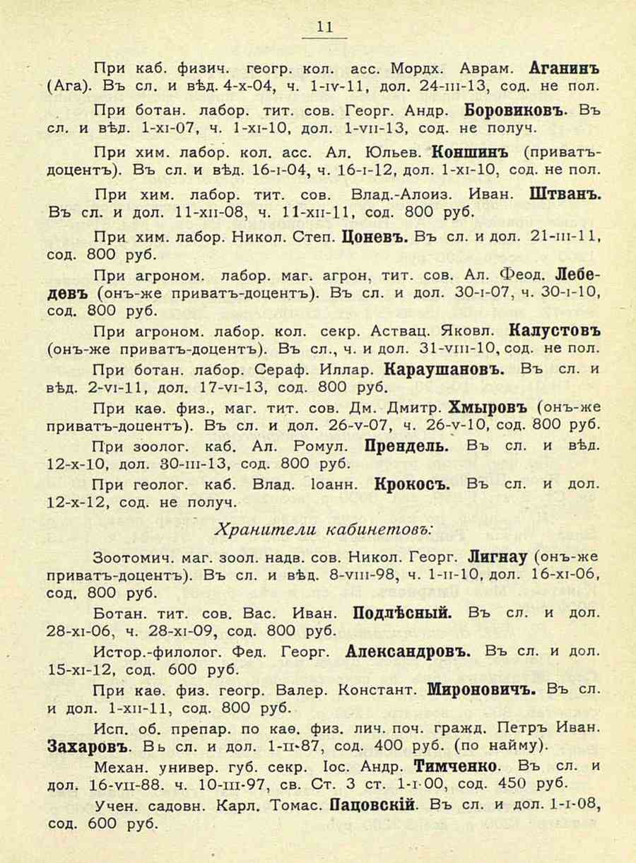 Cyrillic text: 11 При каб. физич. геогр. кол. асс. Мордх. Аврам. Аганив (Ага). В сл. и вед. 4-Х-04, ч. 1-ии-11, дол. 24-ш-ИЗ, сод. не пол. При ботан. лабор. тит. сов. Георг. Андр. БорОВИКОВ- В сл. и вед. 1-хи-07, ч. И-хи-10, дол. 1-ип-13, сод. не получ. При хим. лабор. кол. асс. Ал. Юльев. Коешин (приватъдоцент). В сл. и вед. 16-1-04, ч. 16-1-12, дол. И-хи-10, сод. не пол. При хим, лабор. тит. сов. Влад.-Алоиз. Иван. Штван. В сл. и дол. П-хп-08, ч. 11-хии-Ц, сод. 800 руб, Прн хим. лабор. Никол. Степ. Цонев. В сл. и дол. 21-ш-П, сод. 800 руб. При агроном. лабор. маг. агрон, тит. сов, Ал. Феод. ЛвбвДФБ (он-же приват-доцент). В сл. и дол. 30-1-07, ч. ЗО-и-ИО, сод. 800 руб. Прн агроном. лабор. кол. секр. Аствац. Яковл. КалуСТОВ (он-же приват-доцент). В сл., ч. и дол. 31-иш-10, сод. не пол. При ботан. лабор. Сераф. Иллар. Караушанов. В сл. и вед. 2-ии-ИИ, дол. 17-ии-13, сод. 800 руб. При каф. физ., маг. тит. сов. Дм. Дмитр. ХмырОВ (он-же приват-дочент). В сл. и дол. 26-И-07, ч. 26-и-ИО, сод. 800 руб. При зоолог. каб. Ал. Ромул. Прендель. В сл. и вед. 12-х-Ю, дол. ЗО-ш-13, сод. 800 руб. При геолог. каб. Влад. Иоанн. КрОНОС. В сл. и дол. 12-Х-12, сод. не получ. Храпители кабияетовъ: Зоотомич, маг. зоол. надв. сов. Никол. Георг. Лигнау (он-же приват-доцент). В сл. и вец. 8-иш-98, ч. И-п-10, дол. Иб-хи-06, сод. 800 руб. Ботан. тит. сов. Вас. Иван. ПоДЛеСНЫЙ. В сл. и дол. 28-хи-06, ч. 28-хи-09, сод. 800 руб. Истор.-филолог. Фед. Георг. АнфксандрОВ. В сл. и дол. 15-хи-12, сод. 600 руб. При каф. физ. геогр. Валер. Констант. МирОНОВИЧ. В сл. и дол. И-хп-11, сод. 800 руб. Исп. об. препар. по каф. физ. лич. поч. гражд. Петр Иван. Захаров. Вь сл. и дол. 1-т>87, сод. 400 руб. (по найму). Механ, универ. губ. секр. Иос. Андр. Тимченко. В сл. и дол. 16-ип-88. ч. Ю-ш-97, св. Ст. 3 ст. И-и-ОО, сод. 450 руб. Учен. садовн. Карл. Томас. ПацовСКИЙ. В сл. и дол. 1-1-08, сод. 600 руб. | Translated text: 11