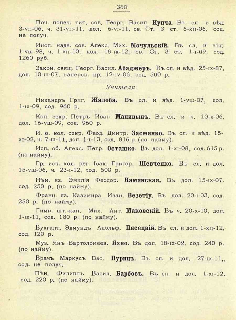 Cyrillic text: 360 Поч. попеч. тит. сов. Георг. Васил. Купча. В сл. и вед. З-ип-06, ч. 31-ип-П, дол. б-ии-11, св. Ст. 3 ст. б-хп-06, сод. не получ. Инсп. надв. сов. Алекс. Мих. МочульСКИЙ. В сл. и вед. И-ищ-98, ч. И-ип-10, дол. 16-их-12, св. Ст. 3 ст, 1-1-09, сод. 1260 руб. Закон. свящ. Георг. Васил. Абадщер. В сл. и вед. 25-ИХ-87, дол. ИО-ш-07, наперсн. кр. 12-ии-06, сод. 500 р. Учителя: Никандр Григ. Шалоба. В сл." и вед, 1-иш-07, дол. 1-их-09, сод. 960 р. Кол. секр. Петр Иван. МаницьиН. В сл. и ч. Ю-х-06, дол. 16-иш-09, сод. 960 р. И. о. кол. секр. Феод. Дмитр. Засмянко. В сл. и вед. 15хи-02, ч. 7-ш-11, дол. ] -1-13, сод. 816р.(по найму). Исп. об. Алекс. Петр. Осташко. В дол. 1-хи-08, сод. 615 р. (по найму). Гр. иск. кол. рег. Иоак. Григор. Шевченко. В сл. и дол. 15-иш-Об, ч. 23-1-12, сод. 500 р. Нем. яз, Эмилия Феодор. Камннская. В дол. 15-их-07. сод. 250 р. (по найму). Франц. яз. Каэимира Иван, ВеЗвТИу. В дол, 20-1-03, сод. 250 р. (по найму). Гимн. шт.-кап. Мих. Ант. МаковскИЙ. В ч. 20-х-ИО, дол. И-их-11, сод. 180 р, (по найму). Вухгалт. Эдмунд Адольф. Пясецкий. В сл. и дол, 1-хп-12, сод, 120 р. Муз. Ян Бартоломеев. Яхно. В дол. 18-их-02, сод. 240 р. (по найму). Врач Маркус Вас. ПурИЦ. В сл. и дол, 27-их-11,, сод. не получ. Пен. Филипп Васил. БарбоС. В сл. и дол. 1-хи-12, сод. 220 р. (по найму). | Translated text: 360
