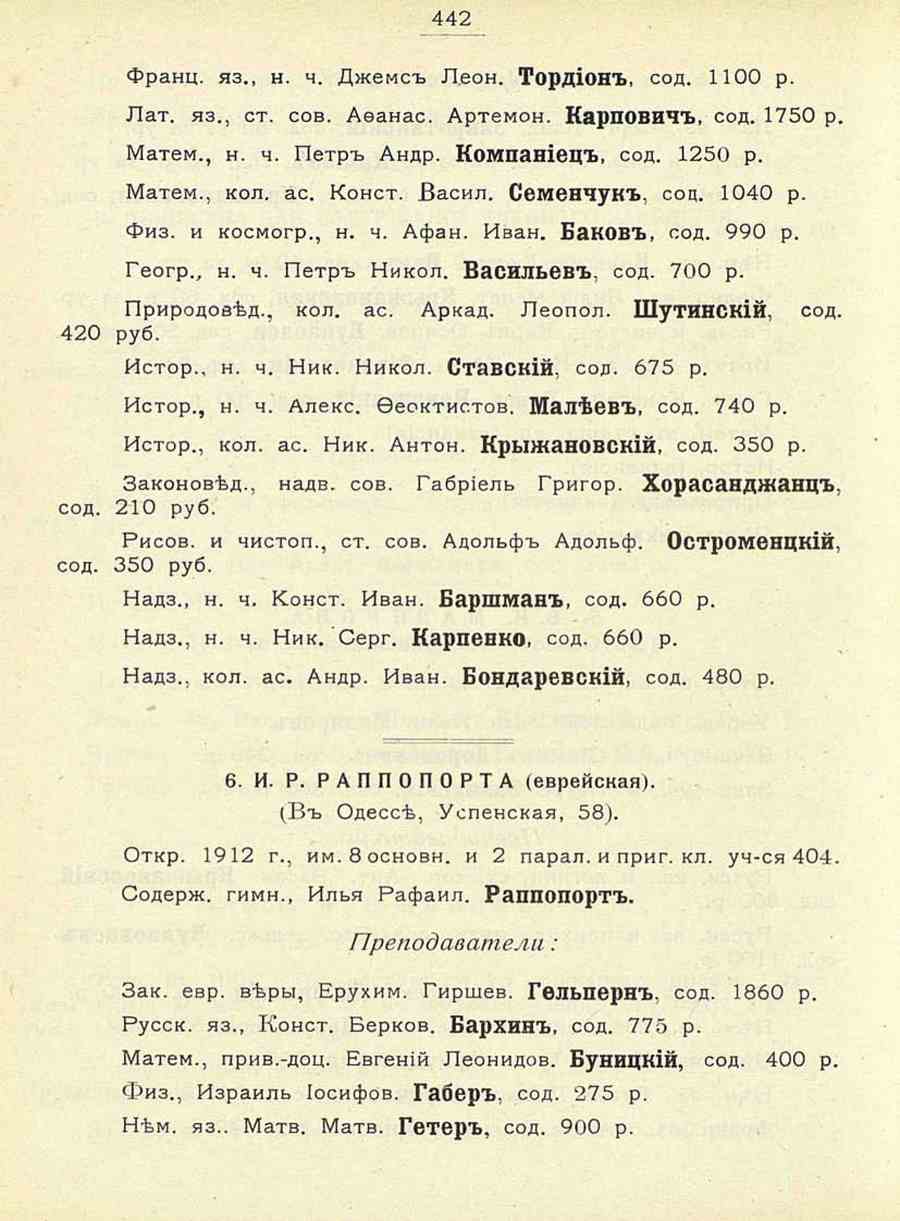 Cyrillic text: 442 Франц. яз., н. ч. Джемс Леон. ТорДИОН, сод. 1100 р. Лат. яз., ст. сов. Афанас. Артемон. КарповиЧ, сод. 1750 р. Матем., н. ч. Петр Андр. КомнанИец, сод. 1250 р. Матем., кол. ас, Конст. Васил. Семевчук, соп. 1040 р, Физ. и космогр,, н. ч. Афан. Иван. БакОБ, сод, 990 р. Геогр., н, ч, Петр Никол. Васильев, сод. 700 р. Природовед.. кол. ас. Аркад. Леопол. ШутинскИЙ, сод. 420 руб. Истор., н. ч. Ник. Никол. СтавскИЙ, сов, 675 р, Истор., н. ч. Алекс. Феоктистов. Малеев, сод. 740 р. Истор., кол. ас. Ник. Антон. КрыжановскИЙ, сод. 350 р. Законовед., надв. сов. Габриель Григор. ХорасандЖЭНЦ, сод. 210 руб. Рисов. и чистоп., ст. сов. Адольф Адольф. ОстрОМвНЦКИЙ, сод. 350 руб. Надз,, н. ч. Конст. Иван. БарпшВН, сод. 660 р. Надэ., н. ч. Ник. Серг. Карпенко. сод. 660 р. Надз,, кол. ас. Андр. Иван. БоидаревскИЙ, сод. 480 р. 6. И. Р. РАППОПОРТА (еврейская). (В Одессе, Успенская, 58). Откр. 1912 г., им.8основн, и 2 парал. и приг. кл. уч-ся 404. Содерж. гимн., Илья Рафаил. Раппопорт. Преподаватели : Зак. евр. веры, Ерухим. Гиршев, ГвЛЬПерн. сод. 1860 р. Русск. яз., Конст. Берков, Бархнн, сод. 77Г> р. Матем., прив.-доц. Евгений Леонидов, БуницкИЙ, сод. 400 р. Физ., Израиль Иосифов, Габер, сод. 275 р, Нем. яз.. Матв, Матв. Гетер, сод. 900 р. | Translated text: 442