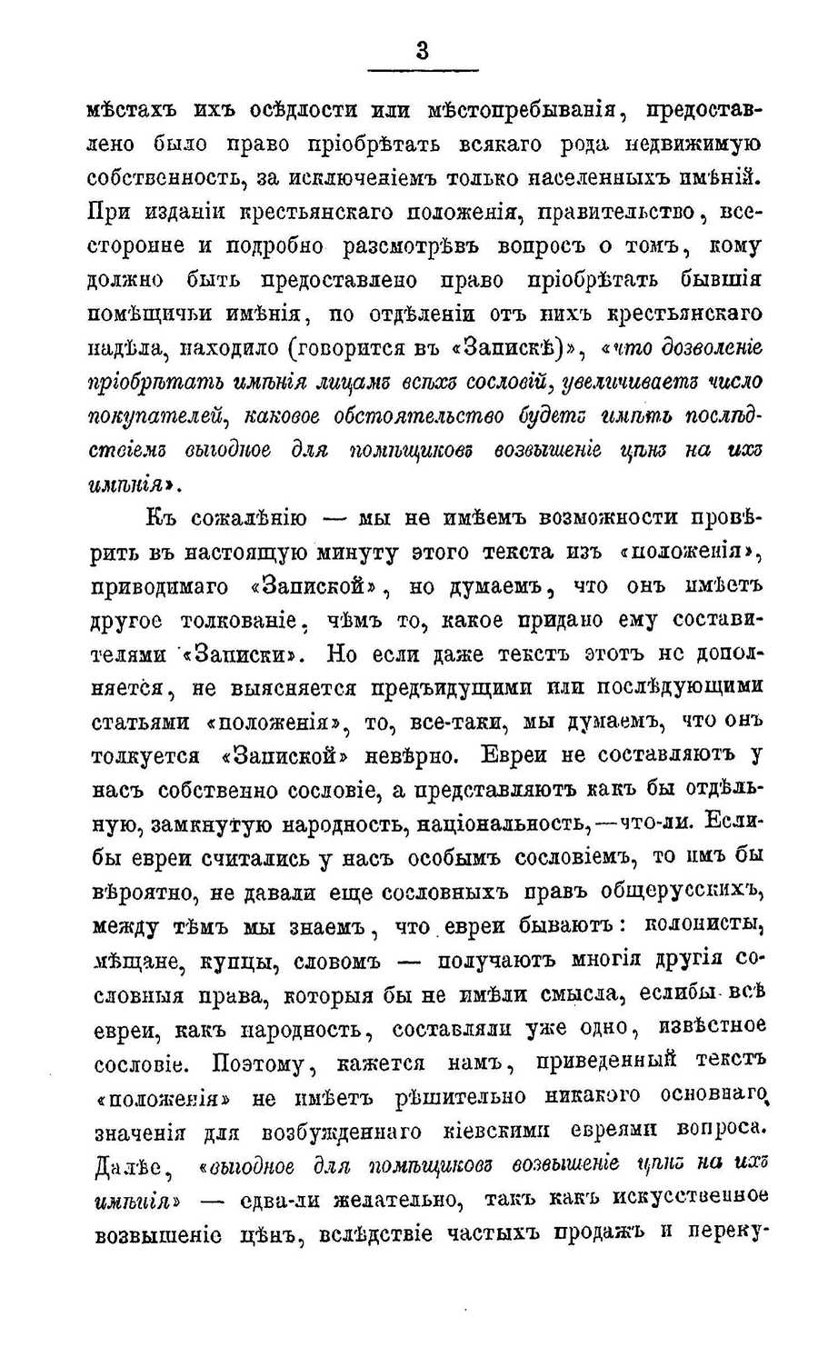 Cyrillic text: 3 местах их оседлости или местопребывания, предоставдено быдо право приобретать всякаго рода недвижимую собственность, за исключением только паселенных пмений. При издании крестьянскаго положеяия, правительство, всесторонне и подробно раземотрев вопрос о том, кому должно быть предоставлено право приобретать бывшия помещичьи имения, по отделении от них крестьянскаго надела, находило (говорится в «Записке)», «что дозволение приобретат имения лицамб всехз сослоеий, увеличиваетз число покупателещ каковое обстоятелъство будетз иметь последстеиемз выгодное для помещиков возвъгшение цепя на ихз имепия». Е сожалению — мы не имеем возможности проверить в настоящую минуту этого текста из «иоложения», приводимаго «Запиской», но думаем, что он имеет другое толкование, чем то, какое придано ему составителями «Записки». Но если даже текст этот нс дополняется, не выясняется предъидущими ши последующими статьями «положения», то, все-таки, мы думаем, что он толкуется «Запиской» неверно. Евреи не соетавляют у нас собственно сословие, а представляют как бы отдедьную, замкнутую народность, национальность,—что-ли. Еслибы евреи считались у нас оеобым сословием, то им бы вероятно, не давади еще сословных прав общерусских, между тем мы знаем, что евреи бываютъ: колонисты, мещане, купцы, словом — получают многия другия сословныя права, которыя бы не имели смысла, еслибы все евреи, как народность, еоставляли уже одно, известное сословие. Поэтому, кажется нам, приведенный текст «положеяия» не имеет решительно никакого основнаго значения для возбужденнаго киевскими евреями вопроса. Далее, «выгодное для, помещиковз вошшение цпнй на ихо имеиия — сдва-ли желателыю, так как искусетвеиное возвышенио цен, вследствие частых продаж и переку- | Translated text: 3