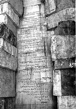 The monument at the site of the destroyed Jewish cemetery with the inscription in Lithuanian: till the year 1941 were buried (here) Jewish residents. The wall bearing the name of Pren in the "Valley of the Communities" in Yad Vashem in Jerusalem.