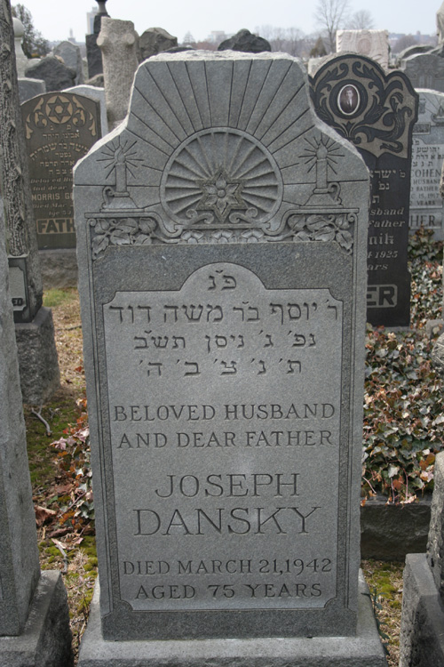 | 11-13-F-3-10 | DANSKY | Joseph | abt. 1867 | 21-Mar-1942 | ג ניסן תשב | 3 Nisan 5702 | 75 | יוסף ב'ר משה דוד | Yosef ben Moshe David | Moshe David | ||||