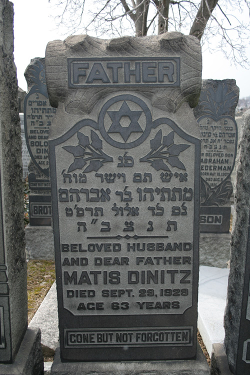 | 11-13-F-3-14 | DINITZ | Mates/Matis | abt. 1866 | 29-Sep-1929 | כד אלול תרפט | 24 Elul 5689 | 63 | מתתיהו ב'ר אברהם | Matityahu ben Avraham | Avraham | ||||