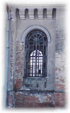 ![]() Close up of an arched window, showing missing glass panes and the general state of disrepair and neglect. |