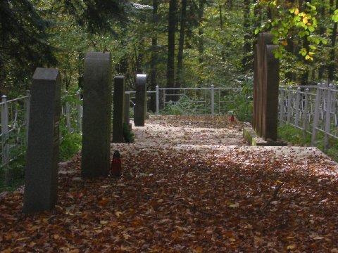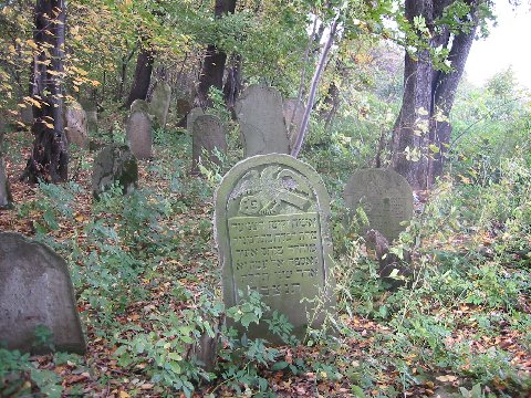 The cemetery is located in the northern part of town. Good, that Wiesio had explained, where to find it, otherwise I would have passed it. It's in the wood along the road that leads to Toki and Jaslo. And there is wood, because there is a grave-yard. Trees have pierced their roots through stone. The few mazzevahs, that are not too damaged, are small and thin. The engraved symbols are simple: a krojn, a hirsch, a sejfer.